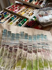 The day starts by laying down the base colours of your landscape on thick cotton canvas. No painting experience is needed for this stage, as you will be given plenty of opportunity to try out techniques and colour combinations. Having an image or photograph as a starting point is useful, as it will give you a colour palette to work with.