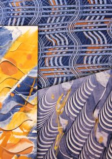 Wheat paste is mixed with pigments and swiftly brushed onto wet paper; then the creativity begins: wooden scrapers, tools, found objects, grouters, combs and fingers can all be deployed to make a riot of swirls and graphic patterns, or neat geometric or floral designs.